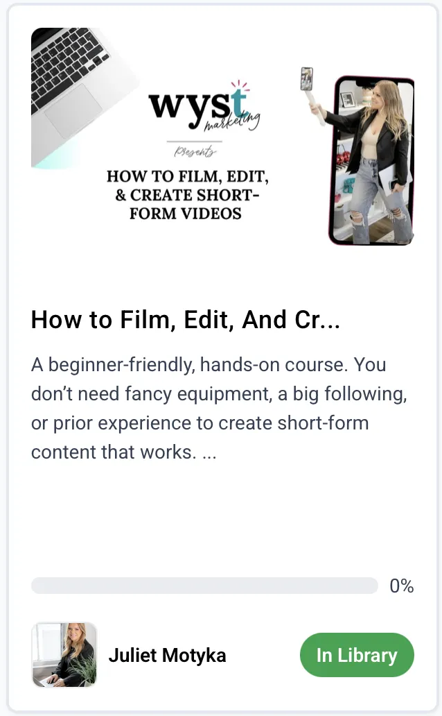 A beginner-friendly course that teaches you how to confidently create Reels, TikToks, Shorts, and Facebook videos — without fancy equipment, tech overwhelm, or perfectionism.